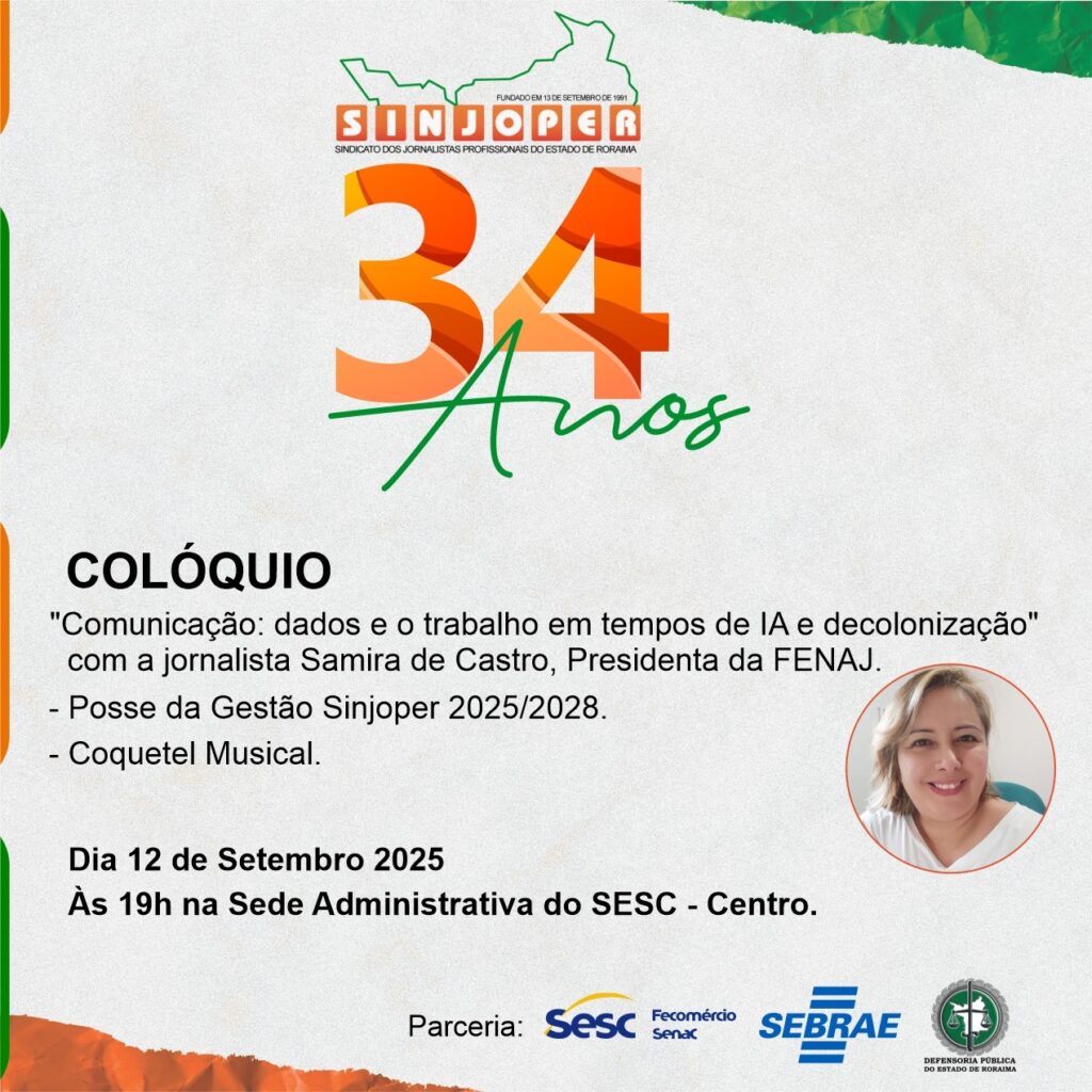 🔶Comemoração dos 34 anos de fundação do Sindicato dos Jornalistas Profissionais do Estado de Roraima – Sinjoper. COLÓQUIO “Comunicação: dados e o trabalho em tempos de IA e decolonização”. 🔶 Participação da presidenta da Federação Nacional dos Jornalistas – FENAJ, jornalista SAMIRA DE CASTRO. 🟢Assinatura do Termo de Posse da Diretoria Executiva e suplentes, Conselho […]