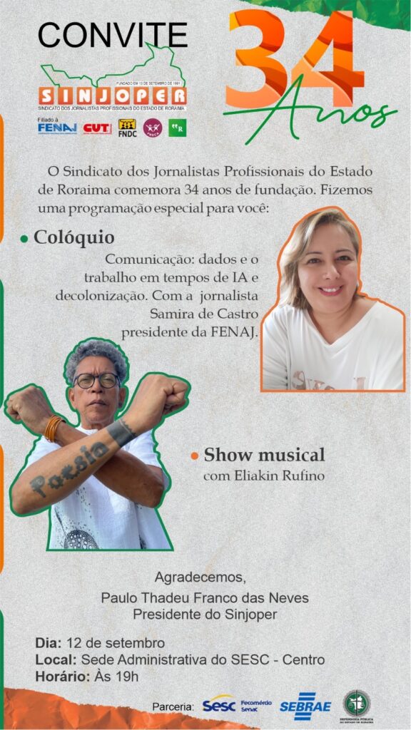 O SINDICATO DOS JORNALISTAS PROFISSIONAIS DO ESTADO DE RORAIMA – SINJOPER, COMEMORA 34 ANOS DE FUNDAÇÃO