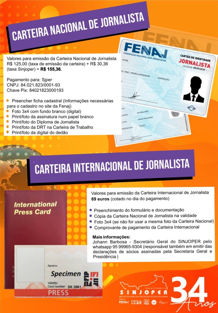 Valores para emissão da Carteira Nacional de Jornalista R$ 125,00 (taxa de emissão da carteira) + R$ 30,36 (taxa Sinjoper) = R$ 155,36. Pagamento para: Sjper CNPJ: 84.021.823/0001-93 Chave Pix: 84021823000193 • Preencher ficha cadastral (Informações necessárias para o cadastro no site da Fenaj) • Foto 3×4 com fundo branco (digital) • Print/foto da assinatura […]