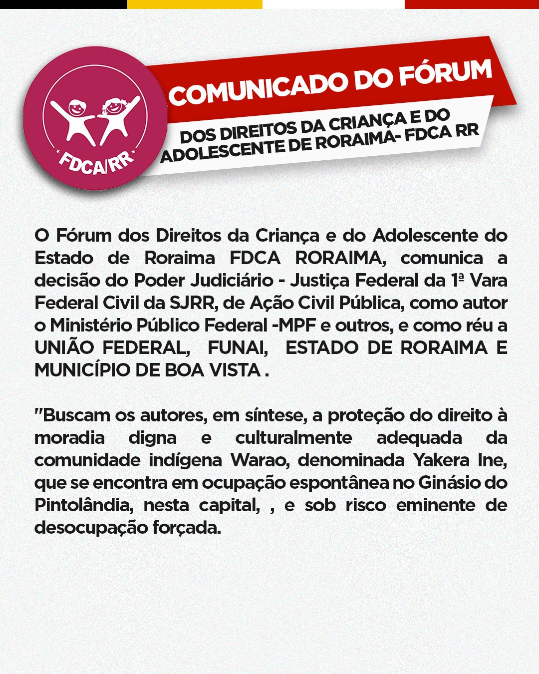 Comunico aos sindicalizados que o Sinjoper, integrante da coordenação do Fórum dos Direitos da Criança e do Adolescente, Fórum DCA, celebra com alegria a decisão da Justiça Federal que impede UNIÃO, ESTADO E MUNICÍPIO de fazer qualquer retirada ou despejo de um grupo de indígenas migrantes Warao do imóvel denominado Ginásio do Pintolândia, sem antes assegurar um espaço ou moradia digna